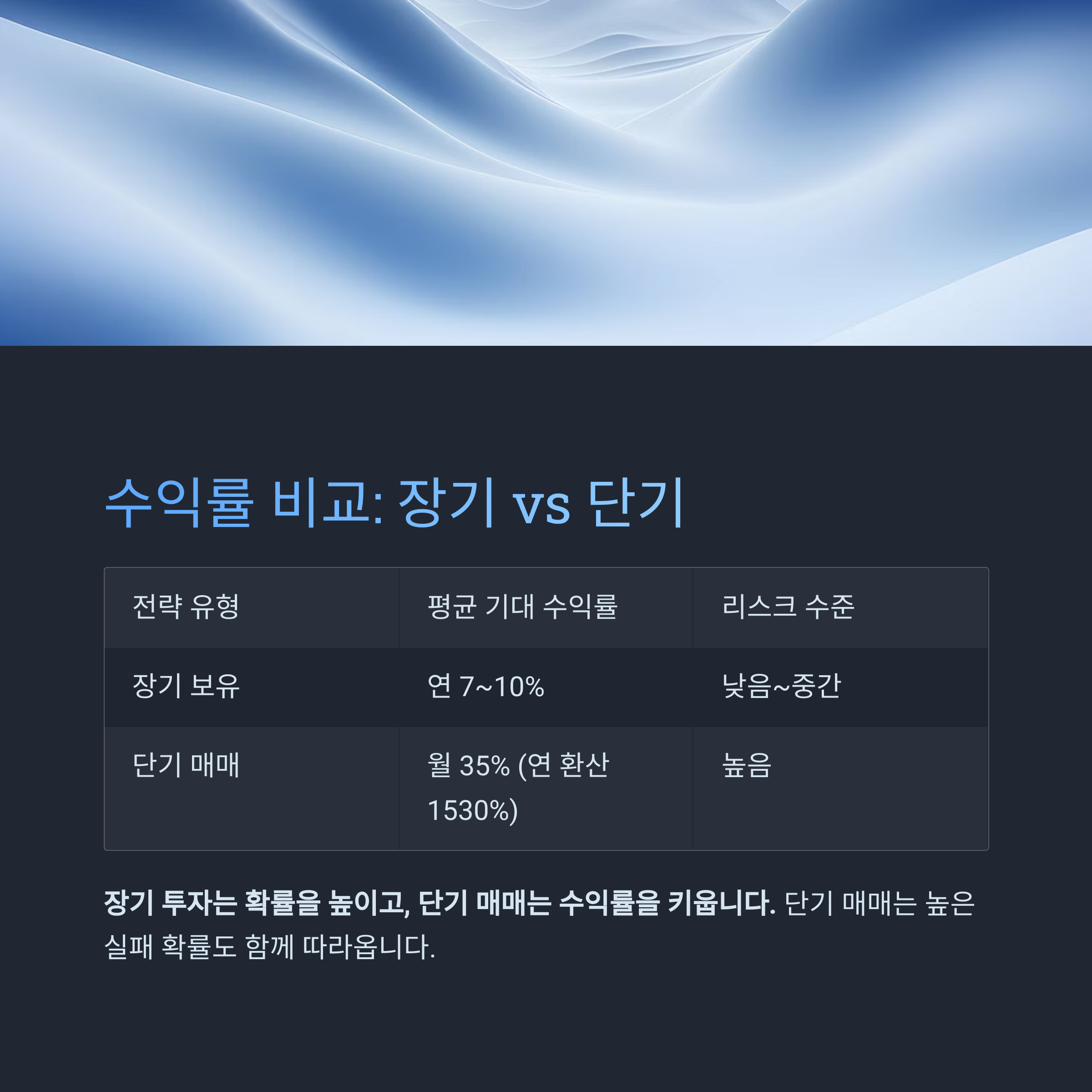 | 전략 포인트 | 복리 효과, 저점 분할 매수 | 매수·매도 타이밍, 손절 라인 |