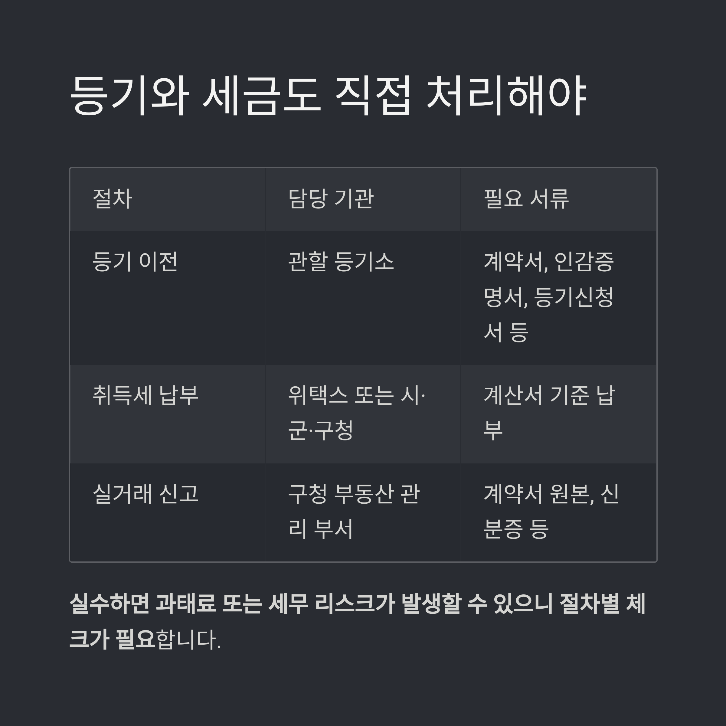 계약서 검토, 등기권리 확인, 등기이전 및 세금신고 절차를 사전에 철저히 준비해야 합니다.